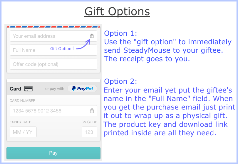 ...Almost without realizing it, as I went back to work my mouse was working normally again. The shaking mouse cursor and accidental multiple double clicking had disappeared. What a relief. Albert J. Bick, CPA ...Last week, he [my boss] and I were working on a document together and he was at the keyboard while I sat alongside, so I had the opportunity to watch him use the mouse. What used to be an excruciating long process was smooth, accurate, and much faster. I can only imagine how frustrating mousing must have been for him when it was hard to control. SteadyMouse has made a huge difference. KAL, Washington DC My dad is a very serious photographer [...] I installed this on the computer and I cannot express how much it has lifted his spirits. He is genuinely delighted and thankful to be able to easily use the computer and Photoshop again. Seth Hardiman As the founder of SteadyMouse, LLC. I am confident you will be impressed and I stand behind my product. If for any reason you are not completely satisfied during the first 70 days after purchase, simply email me for a full, no hassle, refund. I can be reached easily and directly at ben@steadymouse.com You get to install, activate, and try out all of SteadyMouse with that assurance, and we'll send you a reminder email around day twenty-five so you don't forget to make a decision. Choose the option that suits you best!