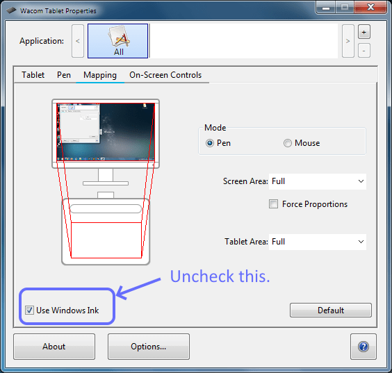 At present, Wacom Tablet support is experimental, however significantly improved starting with v2.8.0.0 released in November 2019. In order to experiment, settings should be changed via the "Wacom Tablet Properties" application and optionally in the SteadyMouse hidden settings. Find below the full instructions for changes to Wacom and SteadyMouse that should allow experimenting with smoothed tablet drawing. Adjusting the Wacom Tablet SettingsWacom tablets have two modes, "Pen Mode" and "Mouse Mode" and starting with SteadyMouse v2.8.0.0 both should be useable. There is a setting called "Windows Ink" in the Wacom options that must be disabled for the best experience. Once configured it should allow the pen to draw extra smooth lines and curves with SteadyMouse cooperating.